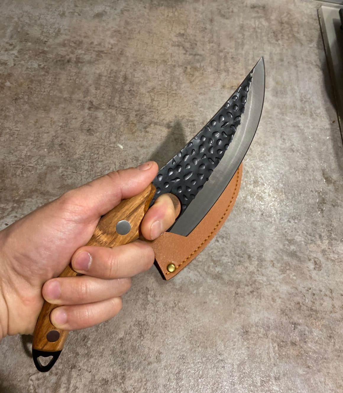 Este es un producto excelente, el diseño es muy ergonómico. Un buen cuchillo en tu mano se siente fuerte y robusto. Promueve un buen agarre y se ajusta de forma segura en tu palma. Es lo suficientemente ligero para cortar vegetales y lo suficientemente pesado para carne. Tiene un buen peso. La artesanía y el diseño son excelentes, lo recomiendo mucho.